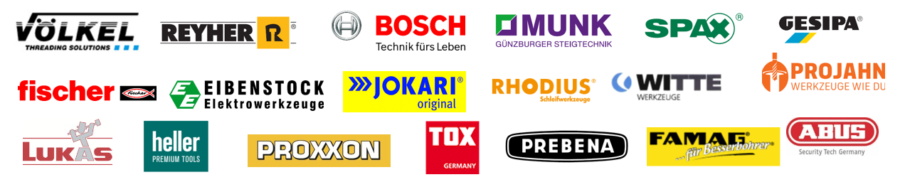 Abus, Bosch, Eibenstock Elektrowerkzeuge, Famag, Gesipa, Heller, Jokari, Lu-kas-Erzett, Munk-Günzburger Steigtechnik, Projahn, Proxxon, Reyher, Rhodius, Prebena, Spax, TOX, Völkel und Witte.